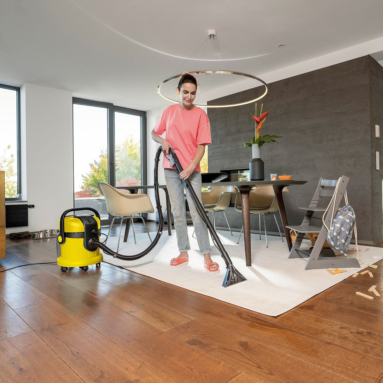 Le Kärcher SE 4004 est un aspirateur-laveur multifonction 3-en-1 destiné au nettoyage en profondeur des surfaces textiles (tapis, moquettes, sièges, coussins, etc.), mais aussi à l’aspiration à sec et humide pour sols durs et résidus liquides. Il combine pulvérisation de détergent + aspiration pour dissoudre et extraire la saleté jusqu’au cœur des fibres, ce qui laisse les surfaces propres et presque sèches après nettoyage. Il est particulièrement adapté pour ménages avec animaux et personnes allergiques.